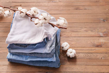 Cotton clothes on wooden background