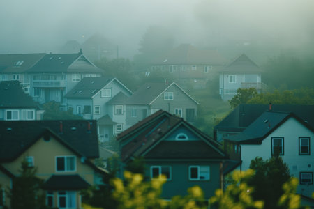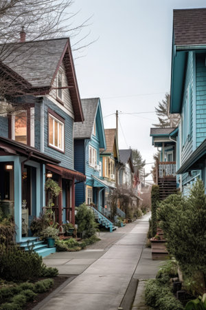 quiet residential street, with houses lined up in perfect symmetry, created with generative ai