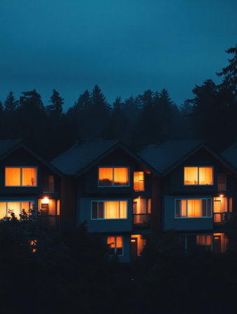 Warm lights glow from windows of three homes as dusk settles over a forested area, creating a calm and peaceful ambiance.