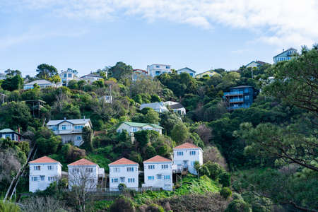 Hillside homes with group of similar repeating architecture across valley in Tinakori, Wellington.