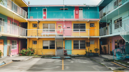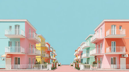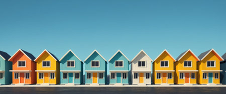 A charming row of colorful residential buildings under a clear blue sky, perfect for creating cheerful vacation memories and enjoying sunny days in a lively neighborhood setting.