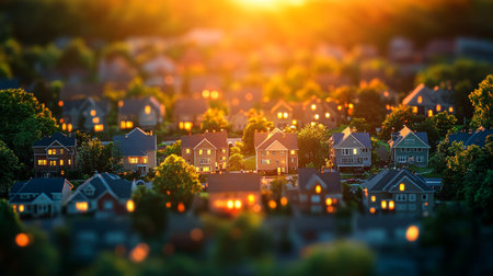 Suburban Neighborhood Bathed in Golden Sunset Light, Concept for Home, Real Estate, and Community