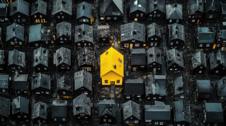 Contrast aerial view of a single yellow house surrounded by rows of black houses, emphasizing uniqueness and creativity