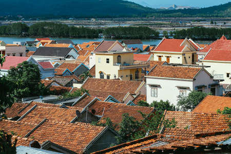 A view of a small country town with traditional houses with orange roofs in Vietnam