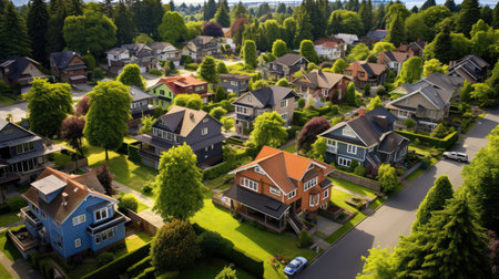 An aerial view captures a vibrant suburban neighborhood on a sunny day. The image showcases a variety of colorful houses with different roof styles, set amidst lush green foliage. Many of the houses have windows that provide glimpses into the homes' interiors, hinting at the families and lives that inhabit this peaceful community.