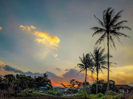 landscape of rice fields and coconut trees, the background of the beauty of the sky and sunset