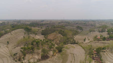agricultural land in rural areas with farmlands, fields with crops, trees in arid hilly terrain. aerial view growing crops in asia in hilly areas Indonesia.
