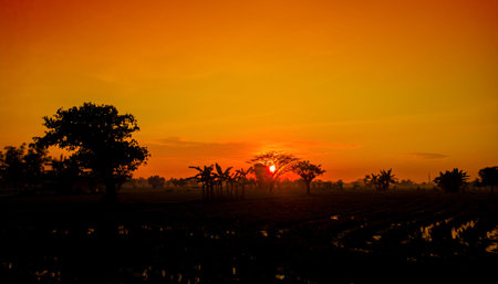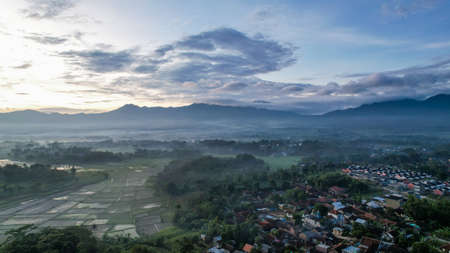 Rural landscape of sunrise with mountains. The sky look dramatic with reddish orange in cloudy weather. Seen Village, rice field and dense of trees covered by mist. Indonesia