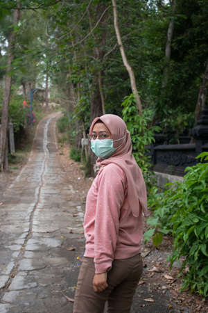 a woman wearing a hijab wearing a mask is walking in the forest during the covid-19 pandemic