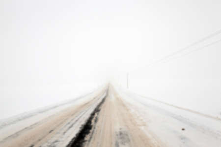 Snow-covered highway (asphalt road) through the country fields in a fog after a blizzard. Dangerous driving, climate change, global warming, ecology, environmental conservation