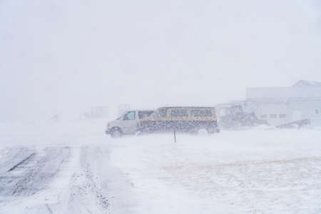 Winter snowstorm, snowfall and ice on roads with strong winds. Poor visibility and dangers on the road, driving safety in winter in bad weather. Cars Navigating Through Heavy Snowstorm Conditions That Create Unique Winter Adventures