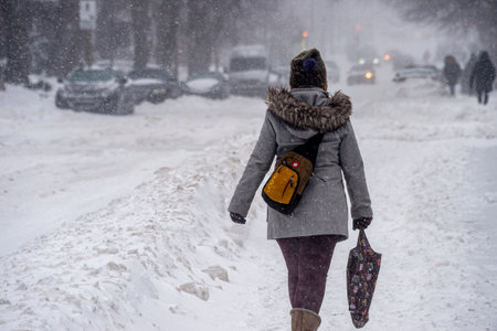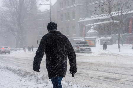 Montreal, CA - 7 February 2020: Pedestrians walking in Downtown Montreal during snow storm.