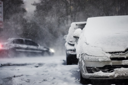 Cars were covered with a thick layer of snow during heavy snowfall, snow storm.