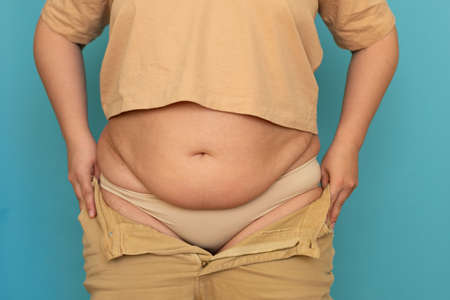 fat woman hand pulling her cellulite on big belly, feeling uncomfortable with tight jeans