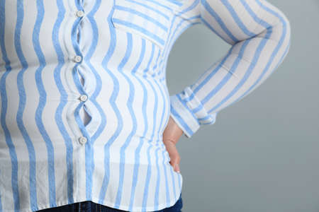 Woman wearing tight clothes on light gray background, closeup view with space for text. Overweight problem