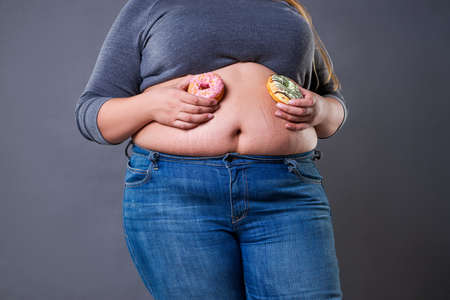 Overweight fat woman from sweet donut and bad junk food, Middle-aged woman with excessive belly fat, Woman muffin top waistline.