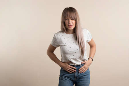 Young woman with hands on stomach having bad aches pain isolated on gray background. Food poisoning, influenza, cramps. Health issues problems concept.