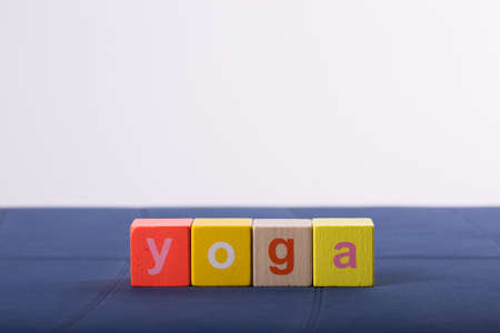 yoga mat with laptop computer ready for an online class or classes with lettering yoga. © Michele Agostinis / Visualbrand Photography