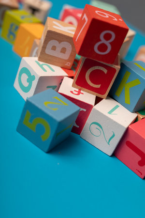 A creative arrangement of colorful wooden blocks on a surface against a blue background, promoting learning and development