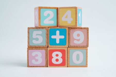 Number wood block cubes for learning Mathematic, education math concept.
