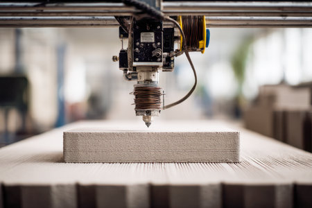 A sleek 3d manufacturing unit engineered for accuracy, layering functional patterns onto a solid block amidst a high-tech, organized workspace.