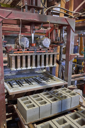Industrial production of building materials from pressed cement mortar. High quality hollow concrete block or cement brick. Finished products stacked on pallets dry after the press.