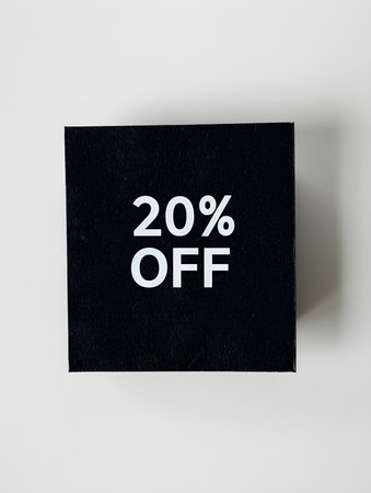 White '20% OFF' Text on a Black Square Paper Note. White Background