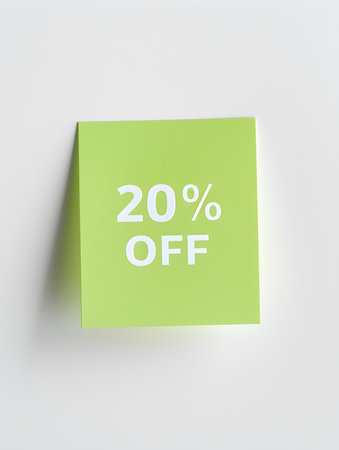 White '20% OFF' Text on a Light Green Square Paper Note. White Background