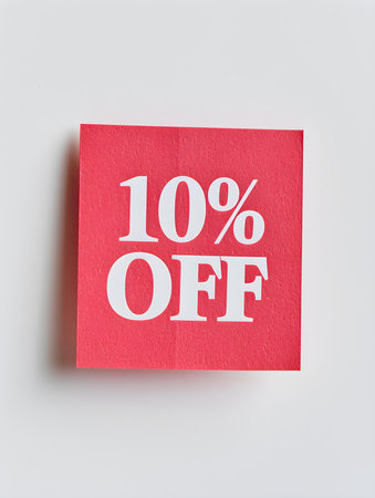 White '10% OFF' Text on a Light Red Square Paper Note. White Background