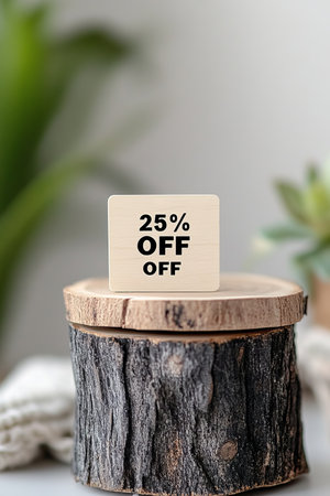 Wooden Block with 25 Discount Announcement on Rustic Log, Minimalist Ecommerce Photography Style