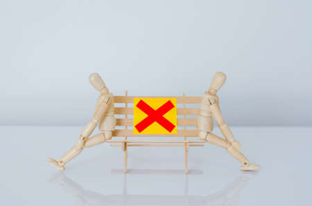 Two wood models sitting on bench and keep distance with the gap to protect infection of coronavirus or covid-19. New normal and social distancing concept.