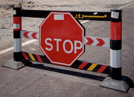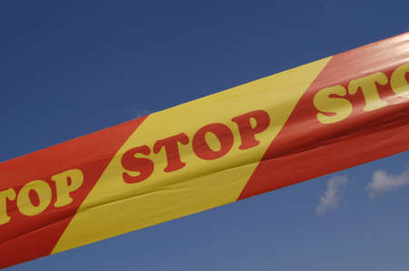 Close-up of a Do Not Enter barrier blocking access, with warning signs and hazard markings