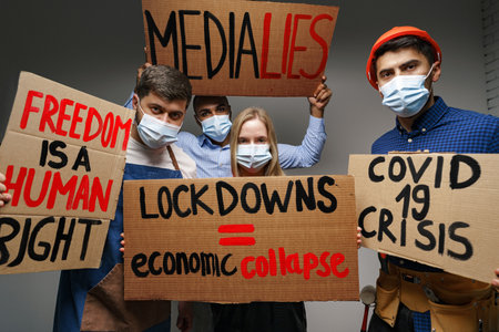 Group of individuals wearing face masks, standing outdoors on a city street.