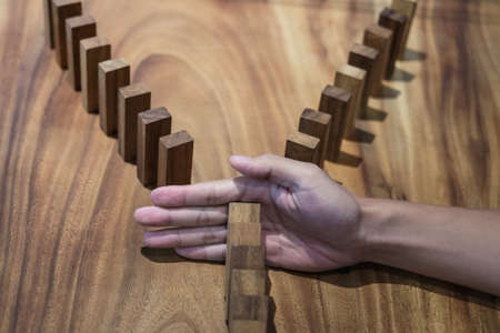 Risk and strategy in business, Close up of businessman hand stopping wooden block between two way from falling in the line of domino.