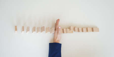 Top view of female hand in elegant blue suit stopping falling dominos from collapsing.