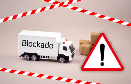 White toy cargo truck or van and signage of prohibition to pass Poland customs border. The concept of border blockade between Poland and Ukraine