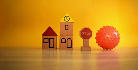 Toy wooden house and a red ball. A picture using toys to draw attention to the topic of self-isolation during a caronovirus pandemic.
