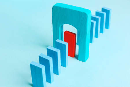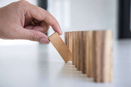 Risk and Strategy in Business, Image of hand gambling placing wooden block on a line of domino, prevention and development to stability.