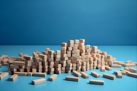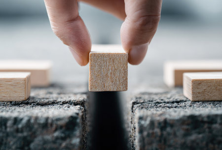 A hand carefully positions a wooden block to bridge a gap between two surfaces. The composition features a close-up perspective with soft lighting and natural textures. The image could be suitable for illustrating concepts of problem-solving, construction, or teamwork in various commercial applications.