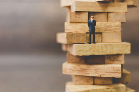 Wood block pile with architecture model with classic black tone background, Concept Risk management and strategy plan, growth business success process and team work.