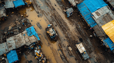 Industrial showing overhead drone view of a chaotic pile of rubble and debris from a demolished building, with sharp shadows keywords: rubble, debris, demolition,...