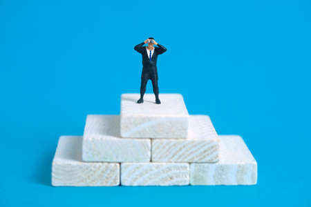 Businessmen standing using binoculars above white stair podium. Miniature tiny people toys photography. isolated on blue background.