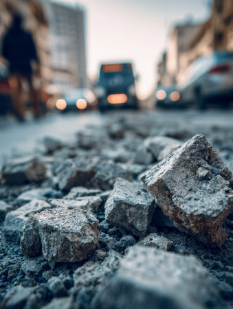 Textured fragments of broken pavement litter a bustling city thoroughfare, with motion-blurred cars and figures emphasizing urban decay and ongoing repairs.
