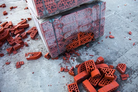 Stack of new silicate bricks in misted polyethylene with the piles of beaten bricks nearby.