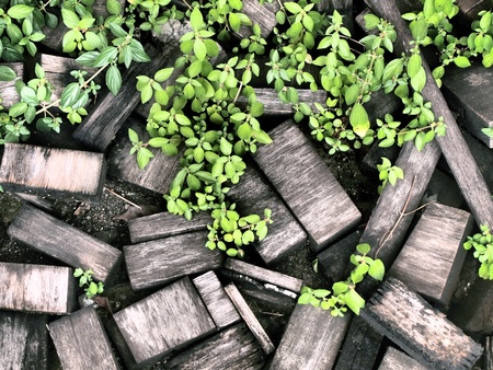 Abstract background of modern cobblestone pavement close-up. Underconstruction renovation concept. Pile of bricks lit by sun