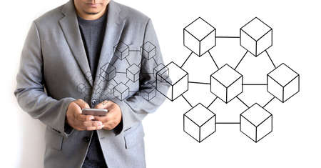 Businessman in blockchain cryptocurrency concept. Mixed media