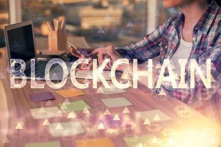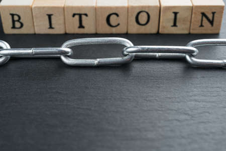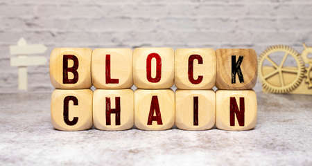 Blockchain word written on wood block. Block chain text on wooden table for your design concept.