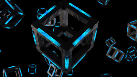 Blue illuminated carbon fiber reinforced cube under black background. Block chain network technology concept illustration. 3D illustration. 3D CG. 3D high quality rendering.