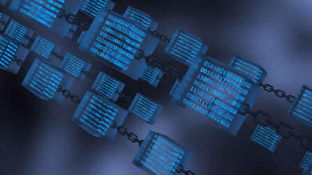 Blue-green glowing binary data in clear glass cubes connected by iron chains under blue lighting background. Block chain network technology concept illustration. 3D illustration.