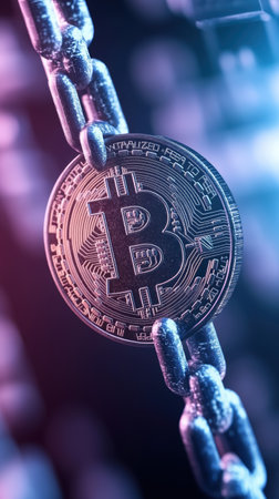 A Bitcoin symbol connected to digital chain, representing blockchain technology